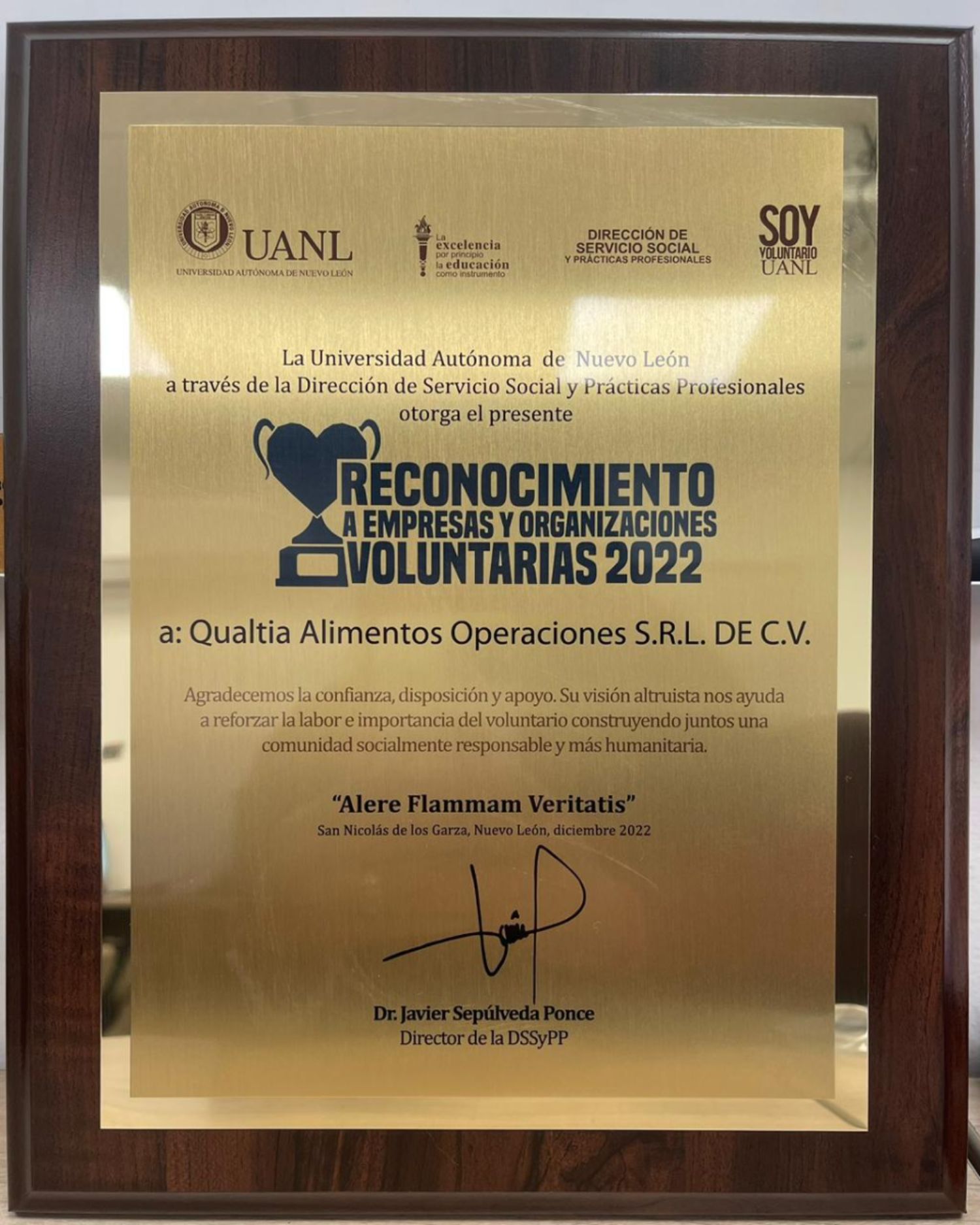 La Universidad Autónoma de Nuevo León reconoce a Qualtia por las acciones de voluntariado realizadas durante el 2022.